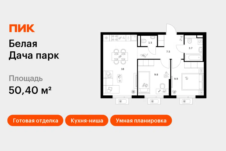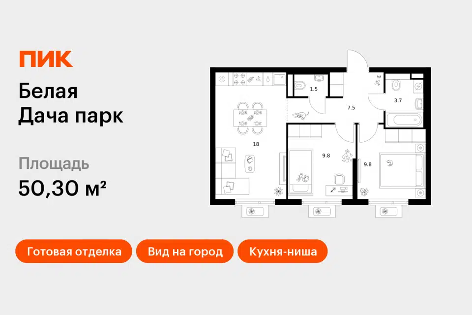 2-комн. кв., 50.3 м², 18/18 этаж