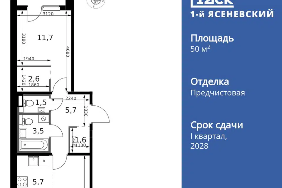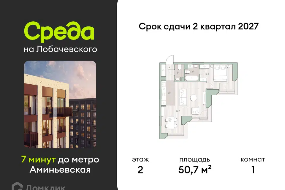 2-комн. кв., 50.9 м², 12/24 этаж