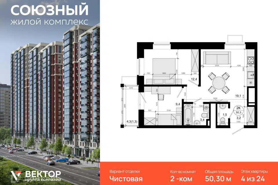 2-комн. кв., 50.3 м², 4/24 этаж