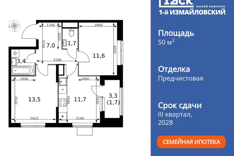2-комн. кв., 50.7 м², 2/12 этаж