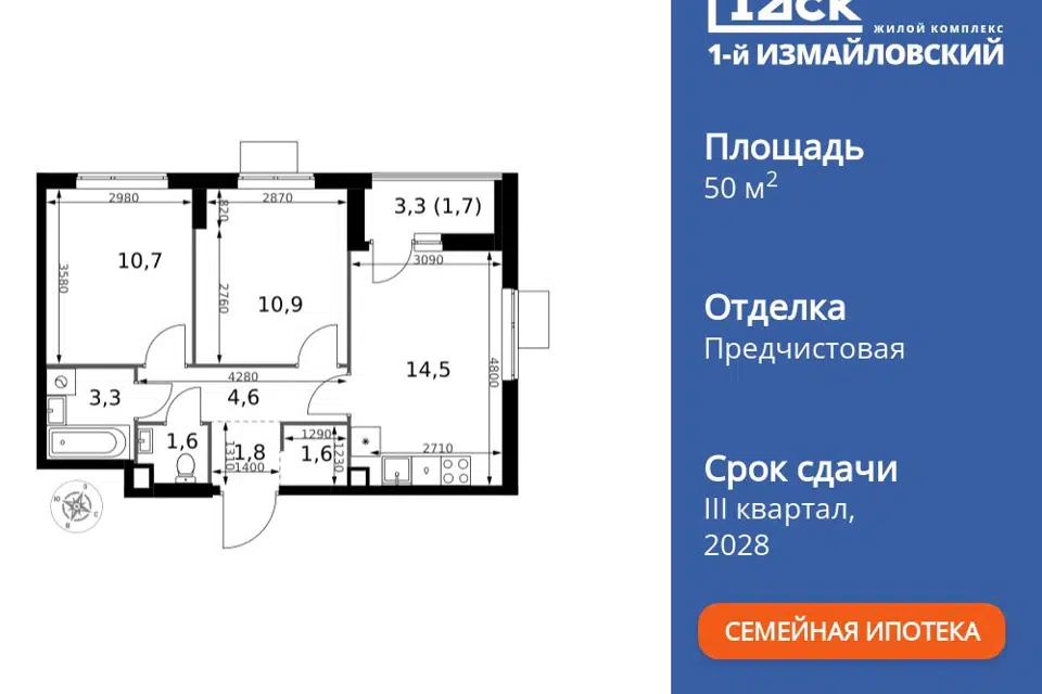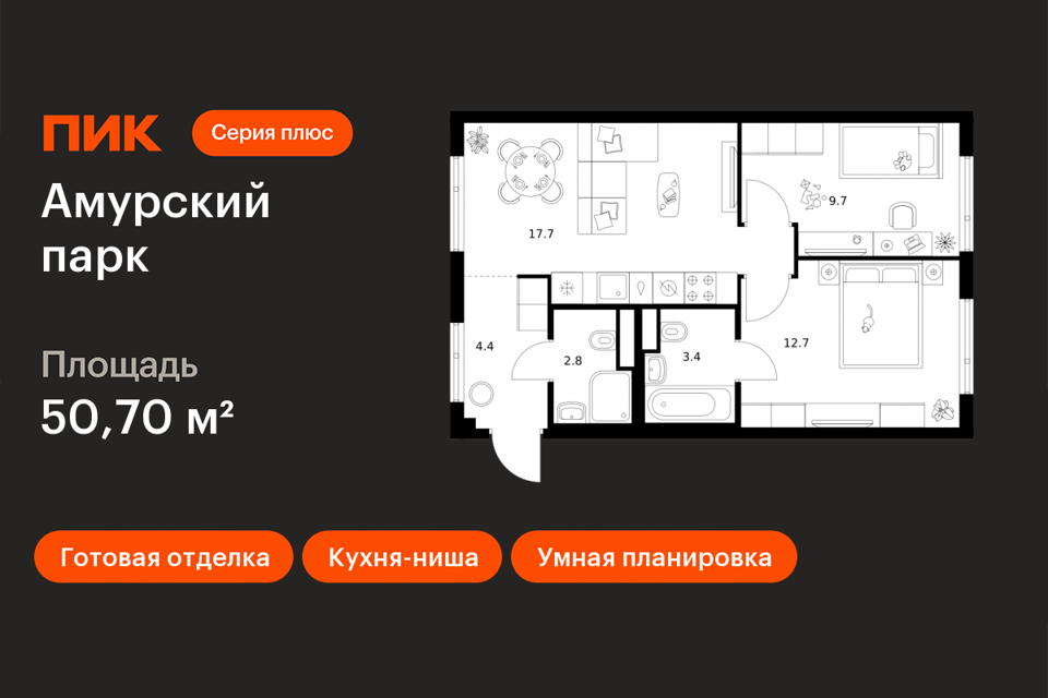 2-комн. кв., 50.7 м², 3/26 этаж