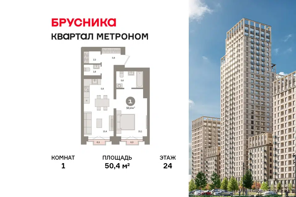 1-комн. кв., 50.4 м², 24/24 этаж