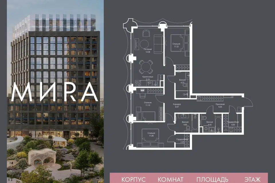 3-комн. кв., 101 м², 3/14 этаж