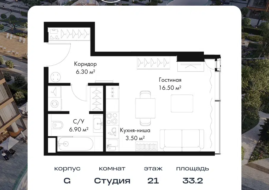 Студия, 33.2 м², 17/36 этаж