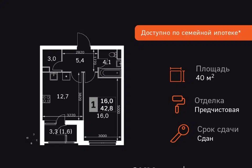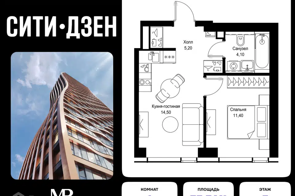 1-комн. кв., 40.6 м², 6/43 этаж