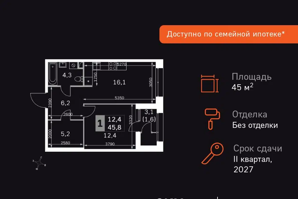 1-комн. кв., 45.8 м², 10/42 этаж