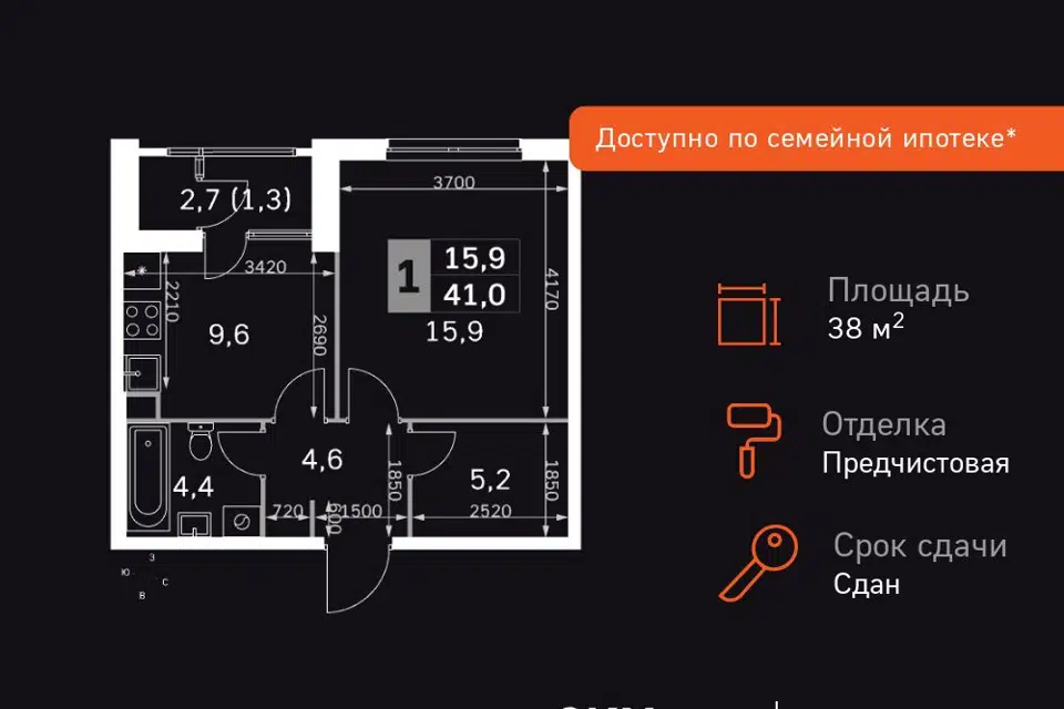 1-комн. кв., 38.8 м², 18/43 этаж