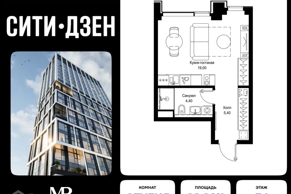 Студия, 28.6 м², 7/23 этаж