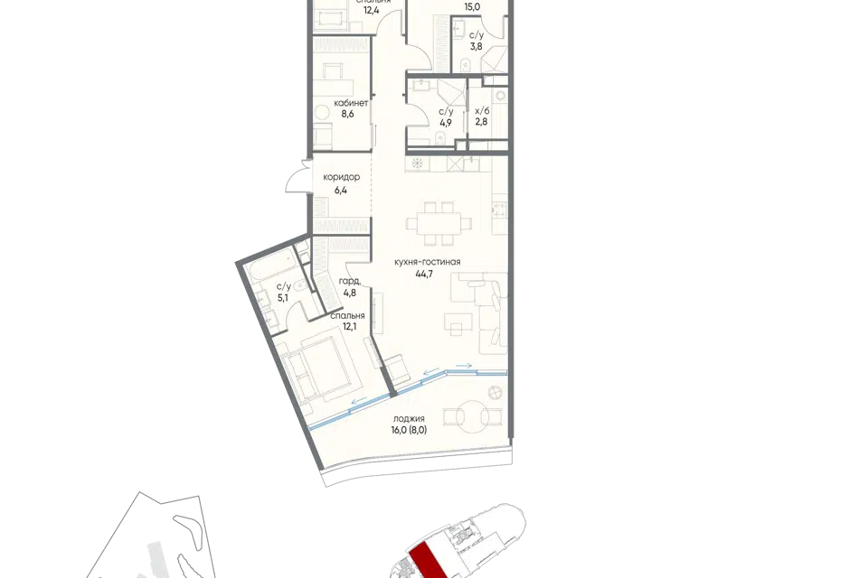 4-комн. кв., 128.6 м², 8/19 этаж