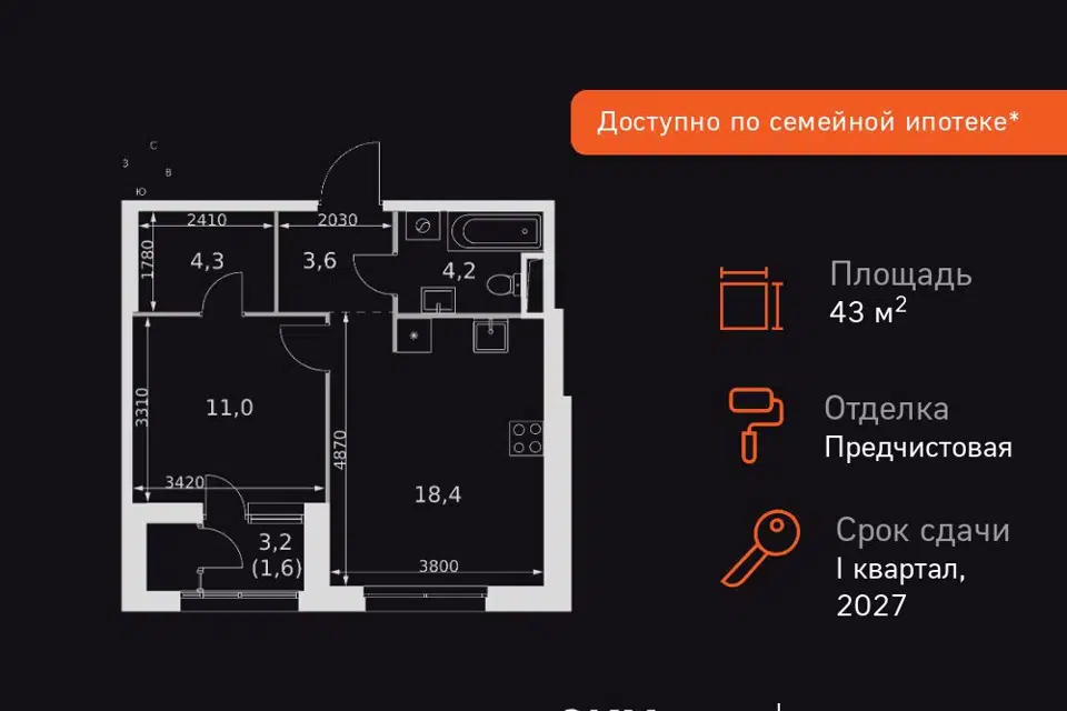 1-комн. кв., 41.8 м², 22/24 этаж