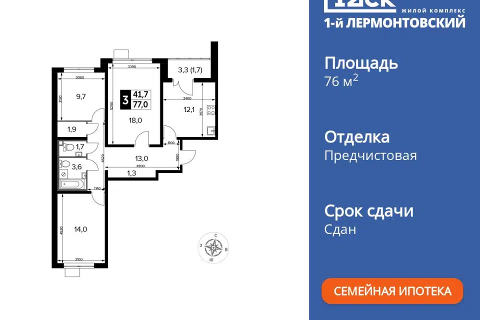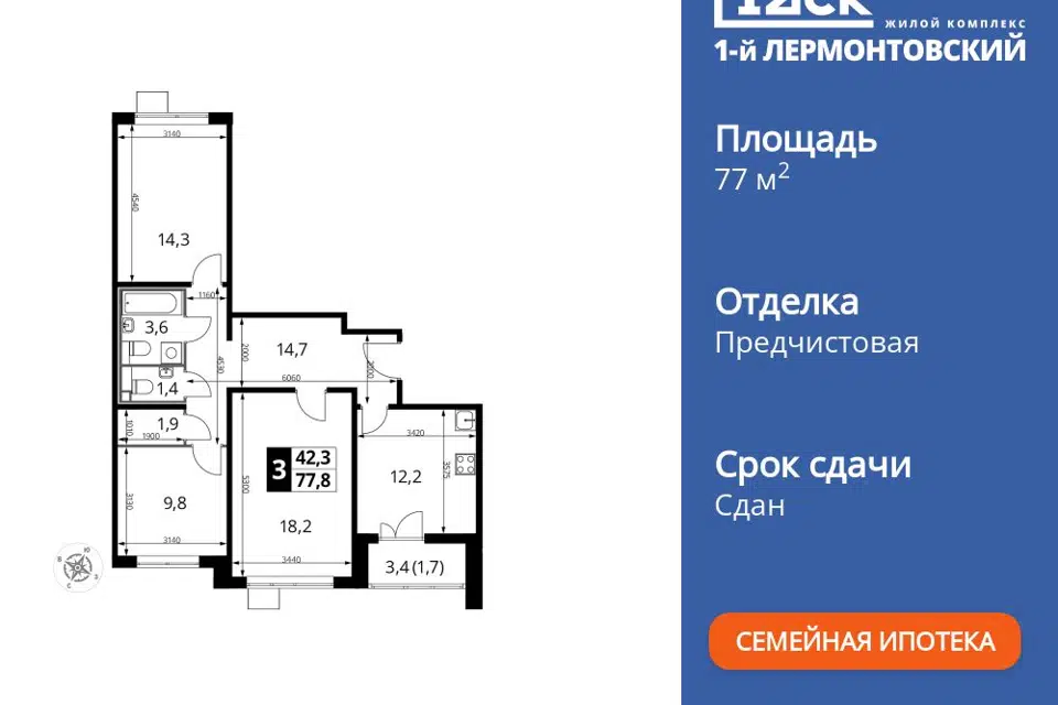 3-комн. кв., 77.8 м², 17/24 этаж