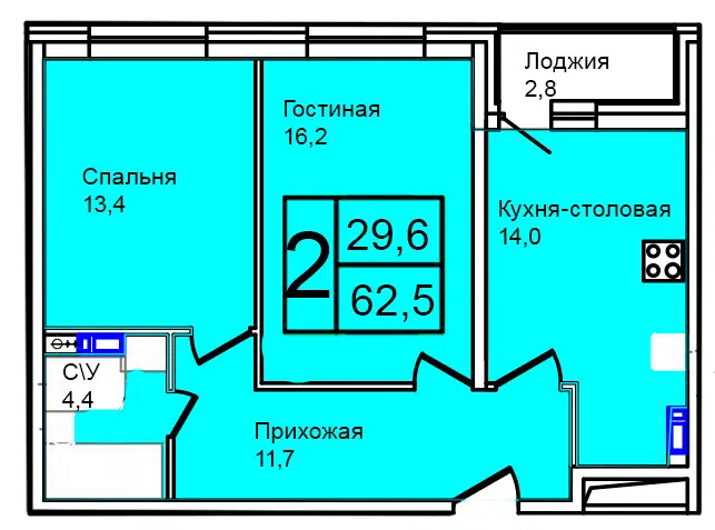 2-комн. кв., 62.5 м², 2/13 этаж