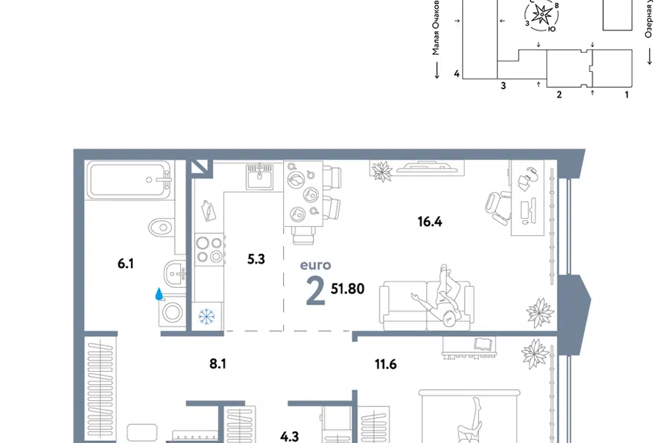 2-комн. кв., 51.8 м², 22/30 этаж