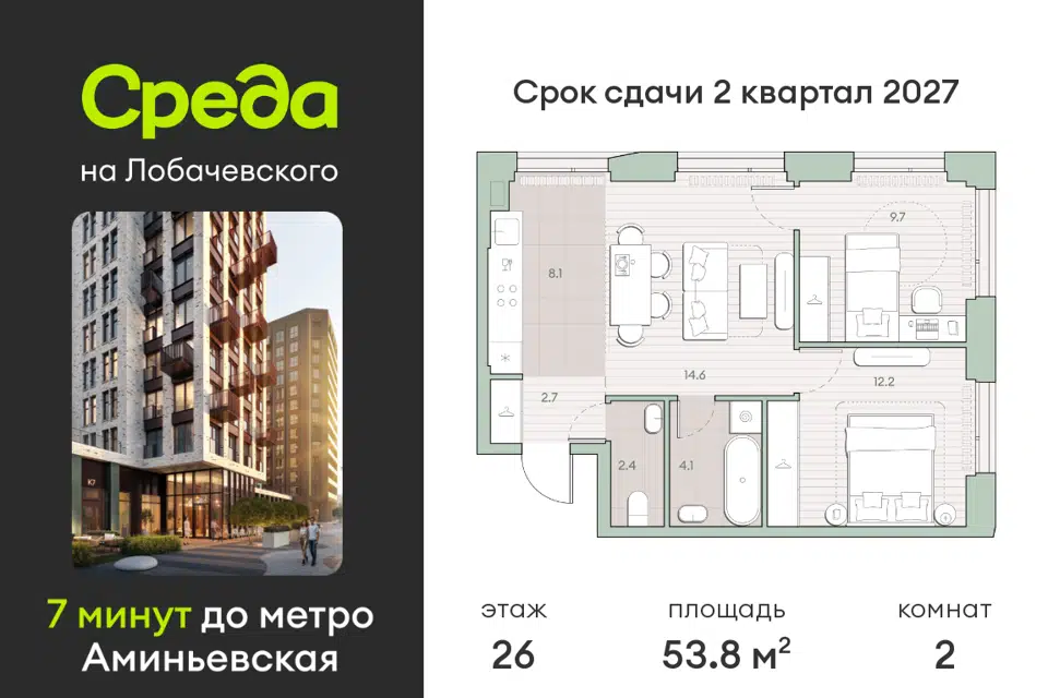 2-комн. кв., 53.8 м², 26/13 этаж