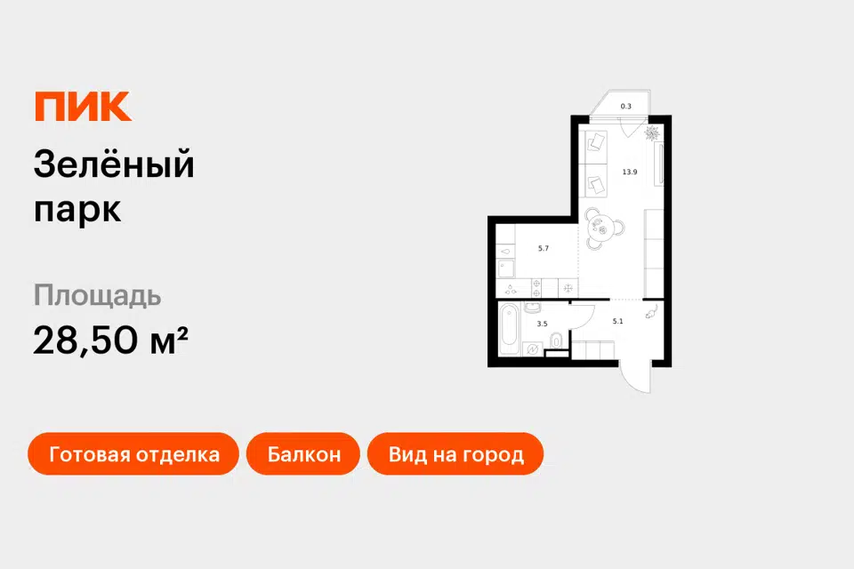 Студия, 28.5 м², 4/24 этаж