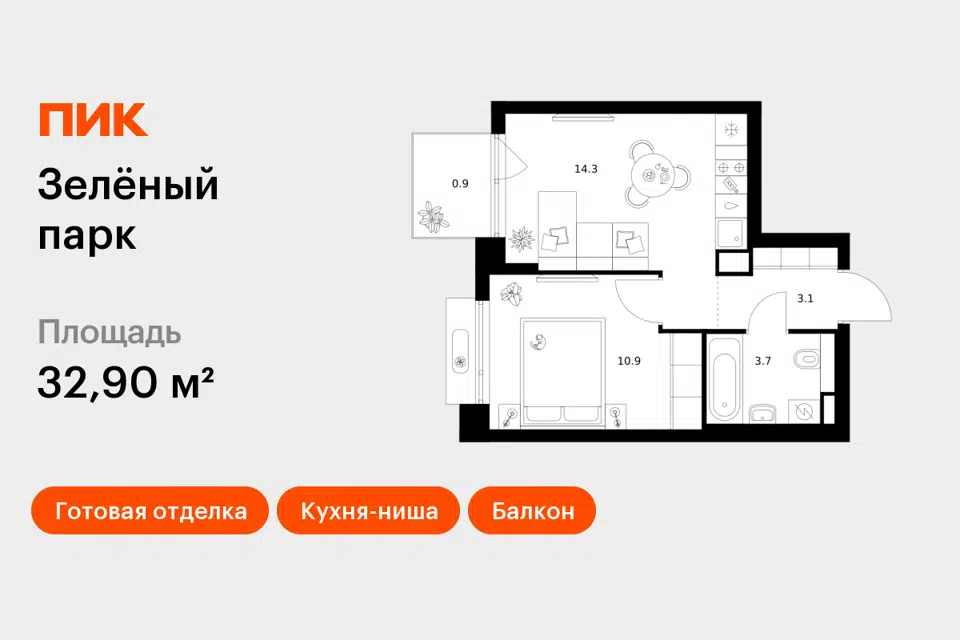 1-комн. кв., 32.9 м², 2/24 этаж
