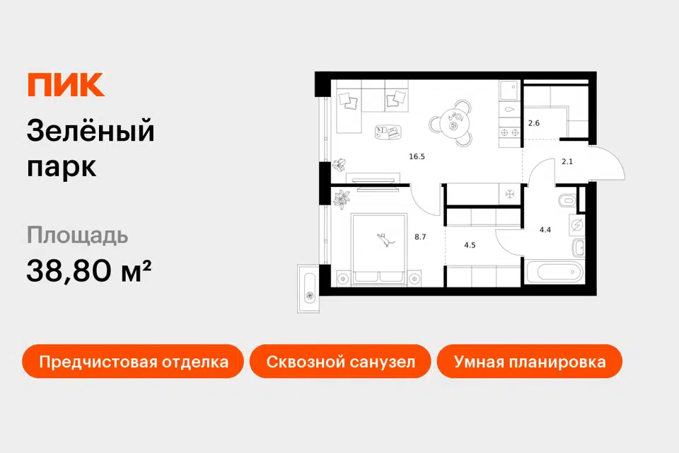 1-комн. кв., 38.8 м², 5/24 этаж