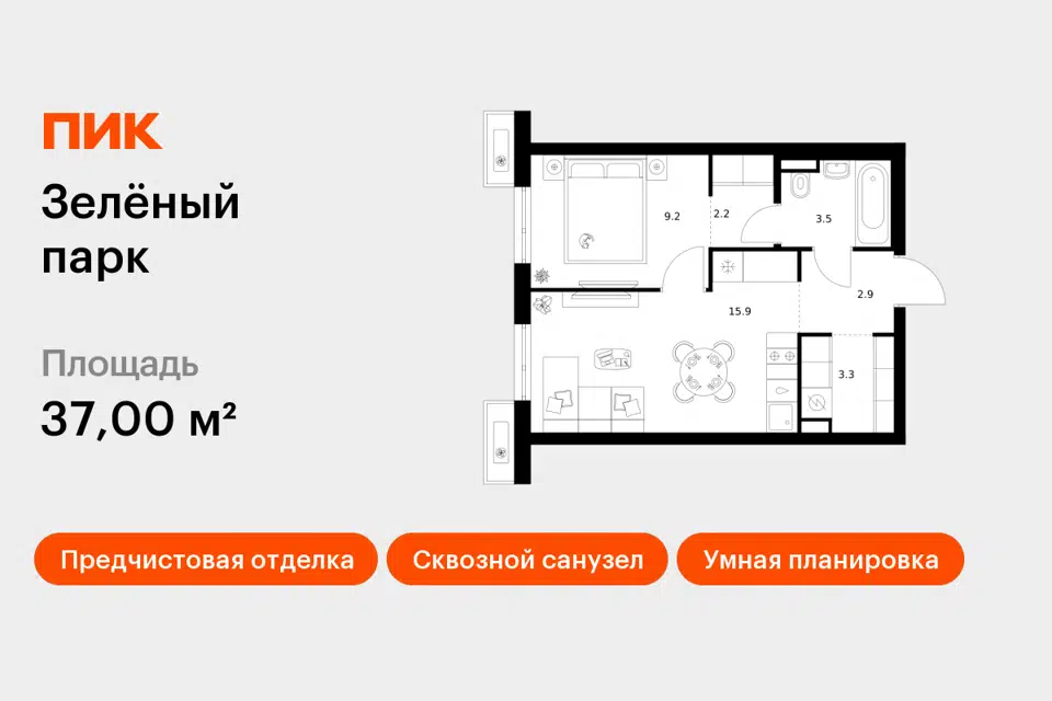 1-комн. кв., 37 м², 7/24 этаж