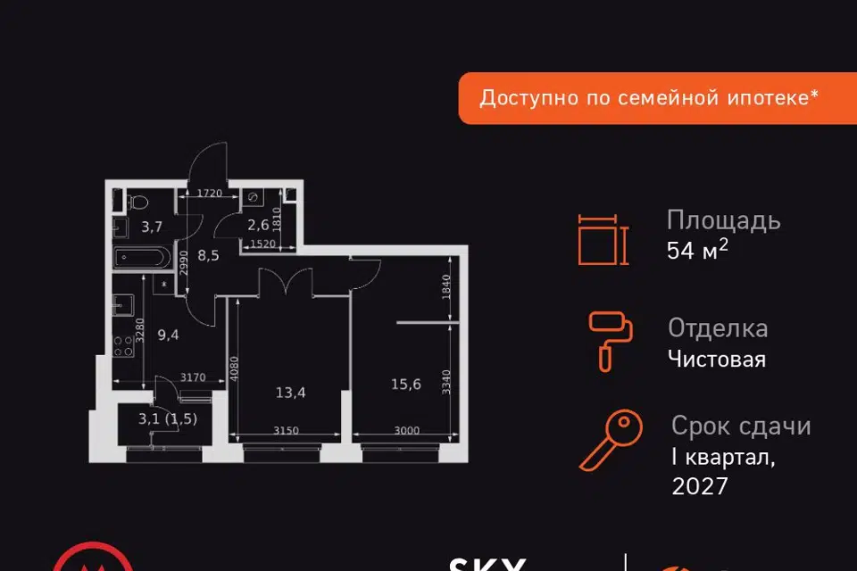 2-комн. кв., 54.7 м², 15/44 этаж