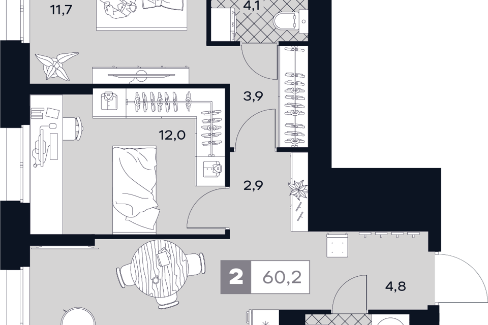 2-комн. кв., 60.2 м², 3/29 этаж