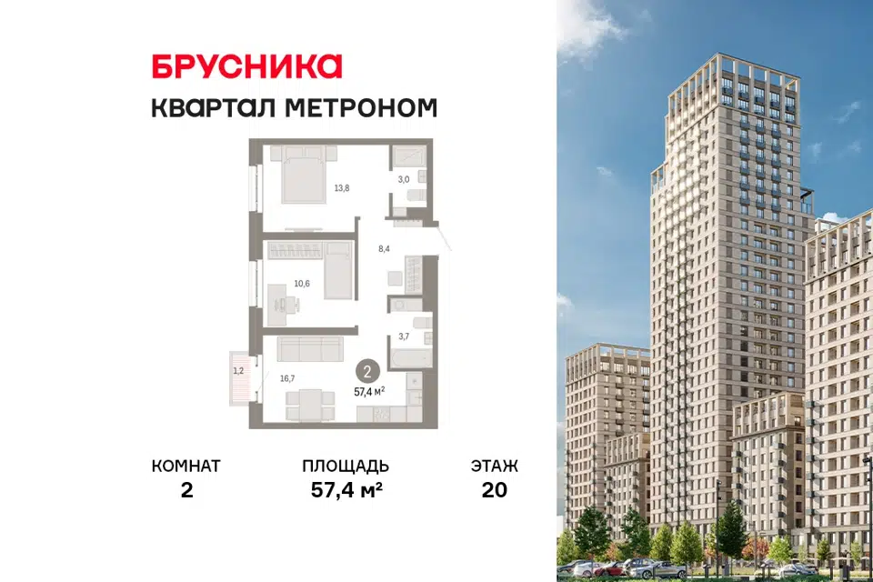 2-комн. кв., 57.4 м², 20/16 этаж