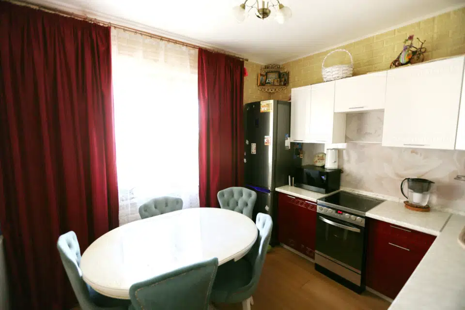 Сама квартира просторная, светлая и теплая. В прихожей установлен вместительный шкаф-купе. Большая комната 20,2 кв.м, кухня 6 кв.м с кухонным гарнитуром. Есть балкон.