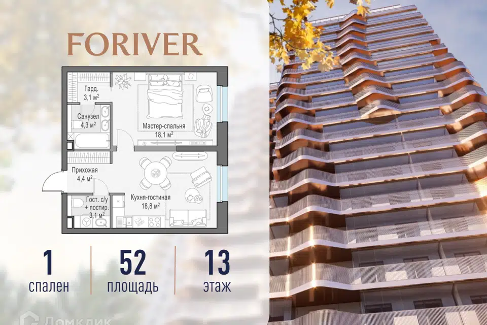 1-комн. кв., 52 м², 13/16 этаж