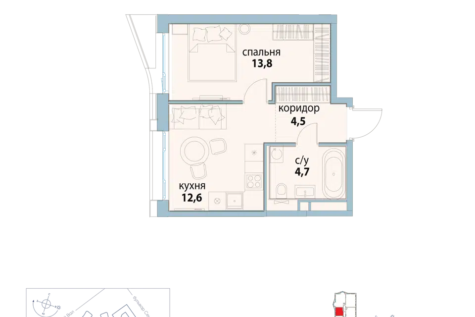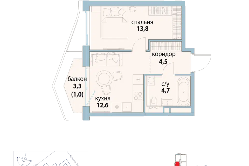 1-комн. кв., 33.9 м², 13/16 этаж