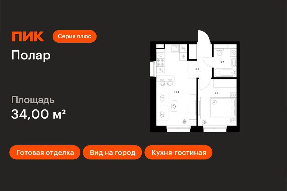 1-комн. кв., 34.47 м², 14/16 этаж