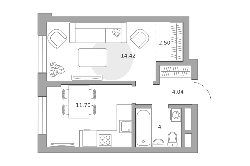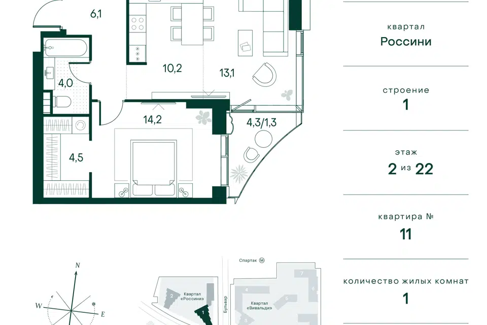 1-комн. кв., 42.1 м², 8/13 этаж
