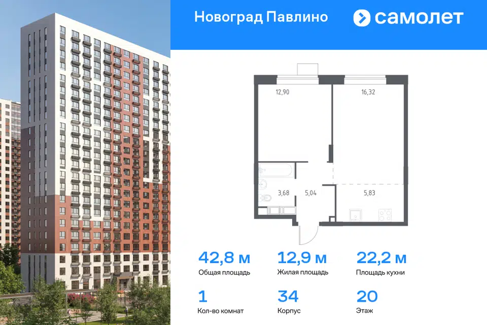 1-комн. кв., от 34.12 м², 3-17 этажи