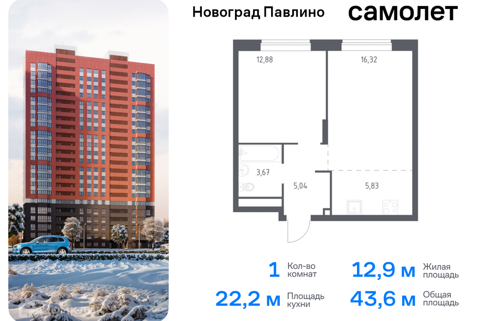 1-комн. кв., от 32.6 м², 5-22 этажи
