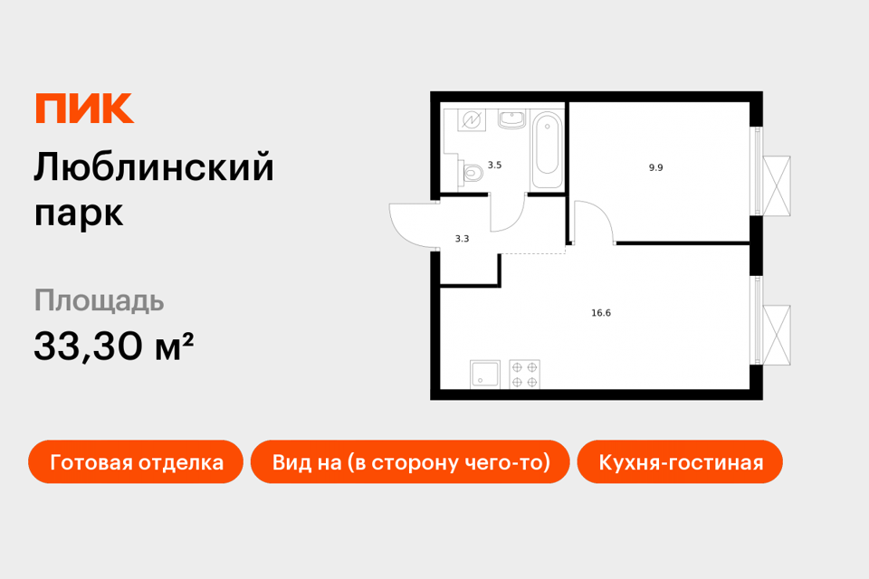 1-комн. кв., от 33.3 м², 11-17 этажи