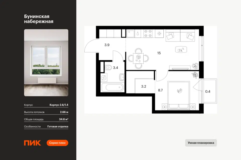 1-комн. кв., 34.6 м², 12/16 этаж