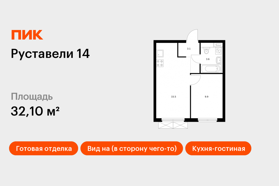 1-комн. кв., от 29.7 м², 3-15 этажи