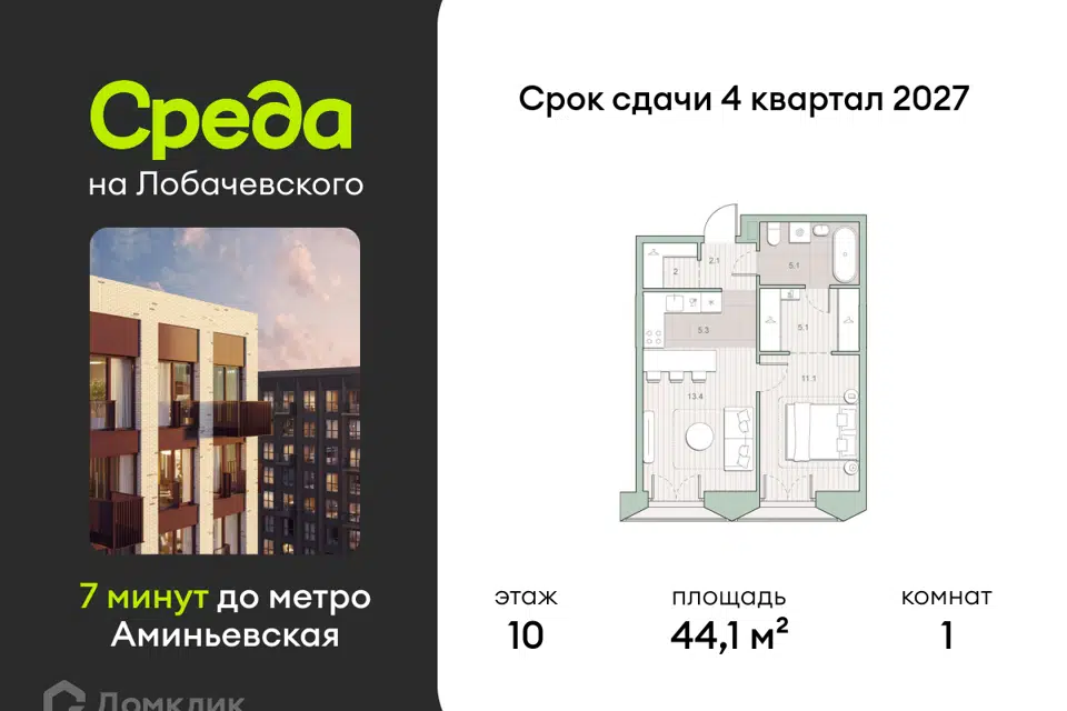 1-комн. кв., 44.1 м², 10/13 этаж