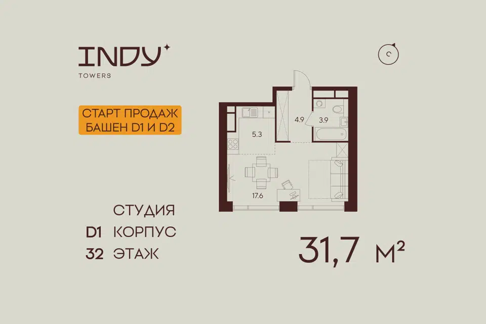 Студия, 31.7 м², 32/55 этаж