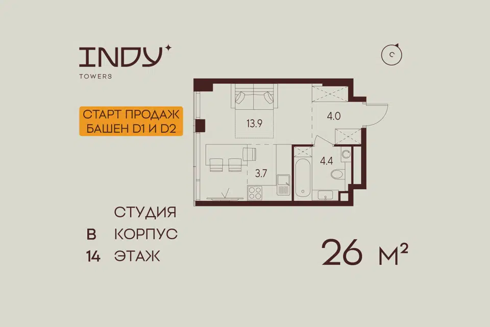 Студия, 26 м², 14/26 этаж