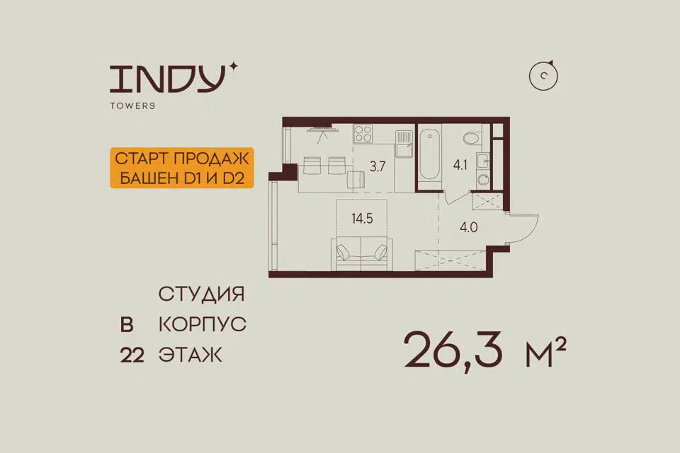 Студия, 26.3 м², 22/26 этаж