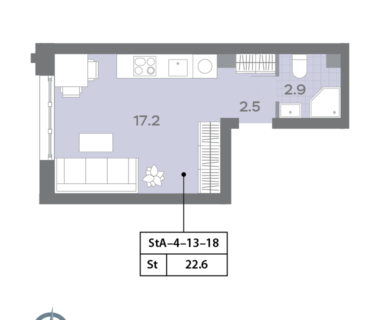 Студия, 22.57 м², 15/17 этаж