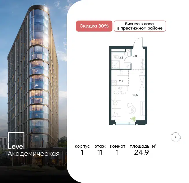 Студия, от 22.3 м², 3-30 этажи