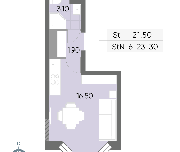 Студия, 21.5 м², 28/31 этаж