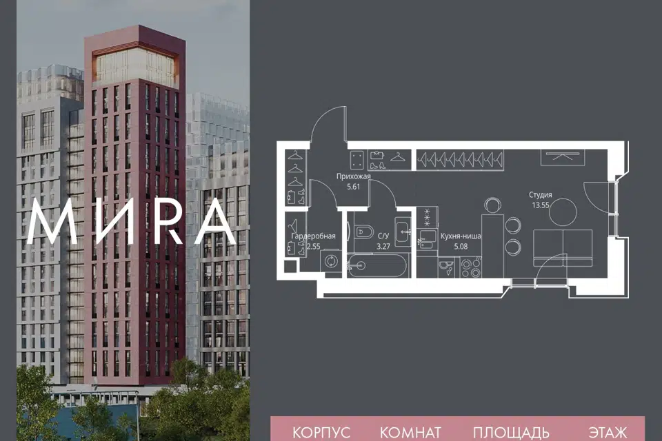 Студия, 29.5 м², 5/55 этаж
