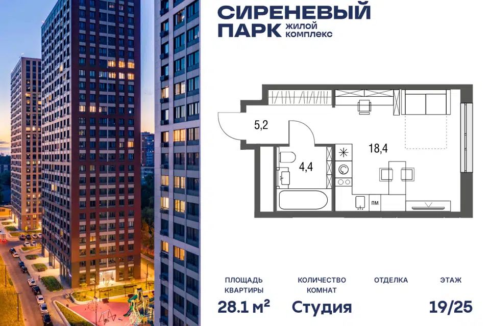 Студия, 28.1 м², 19/25 этаж