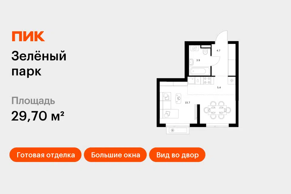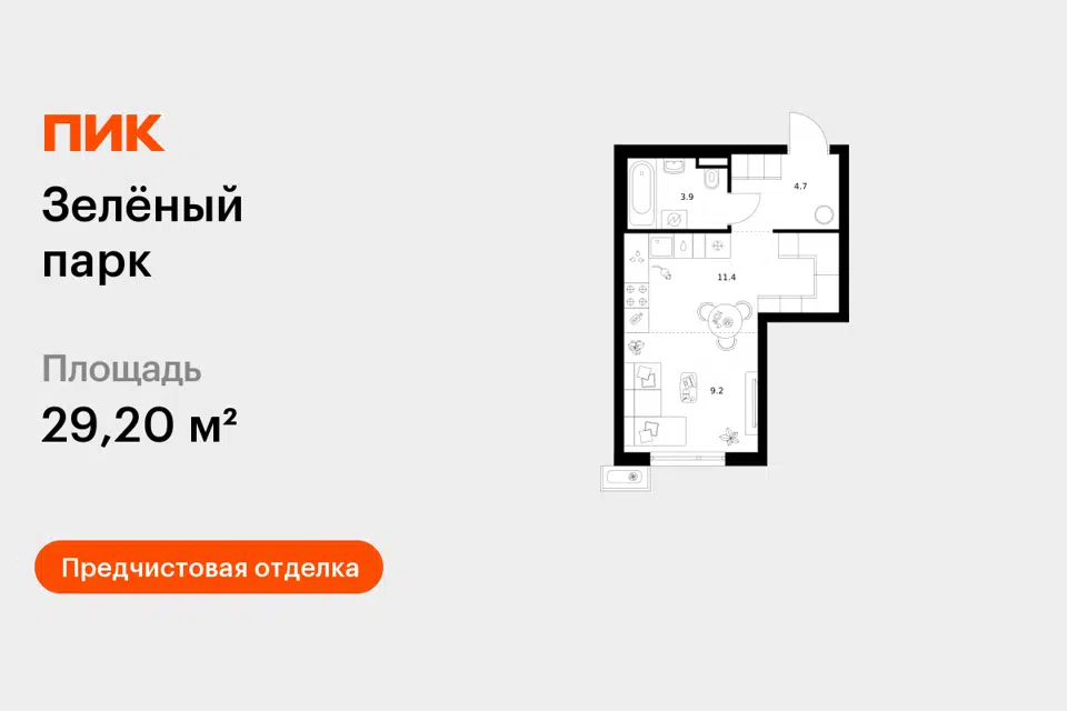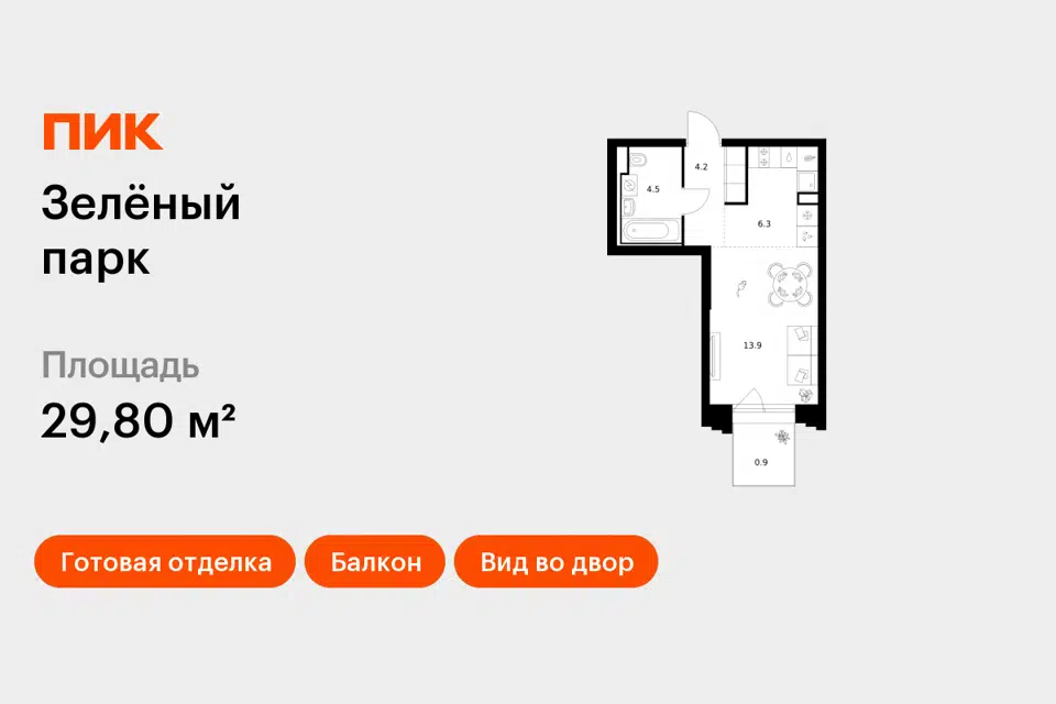 Студия, 15.3 м², 9/9 этаж