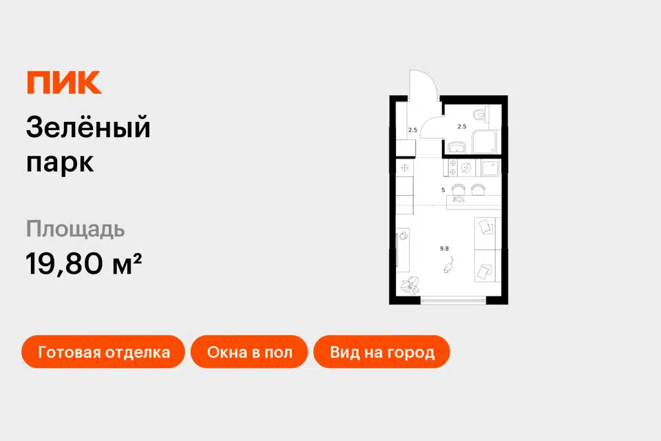 Студия, 19.8 м², 22/25 этаж