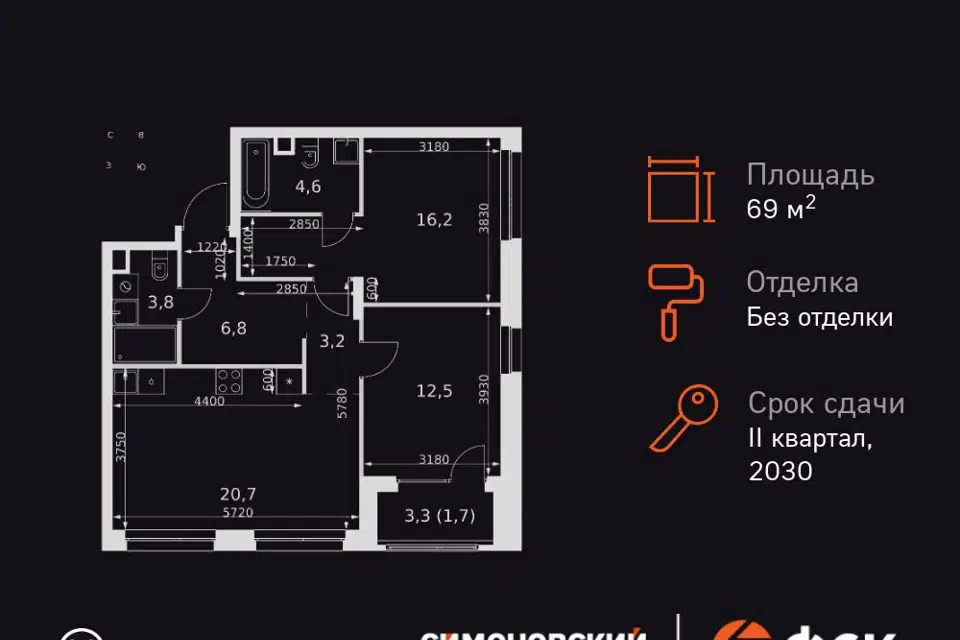 3-комн. кв., 69.4 м², 16/27 этаж