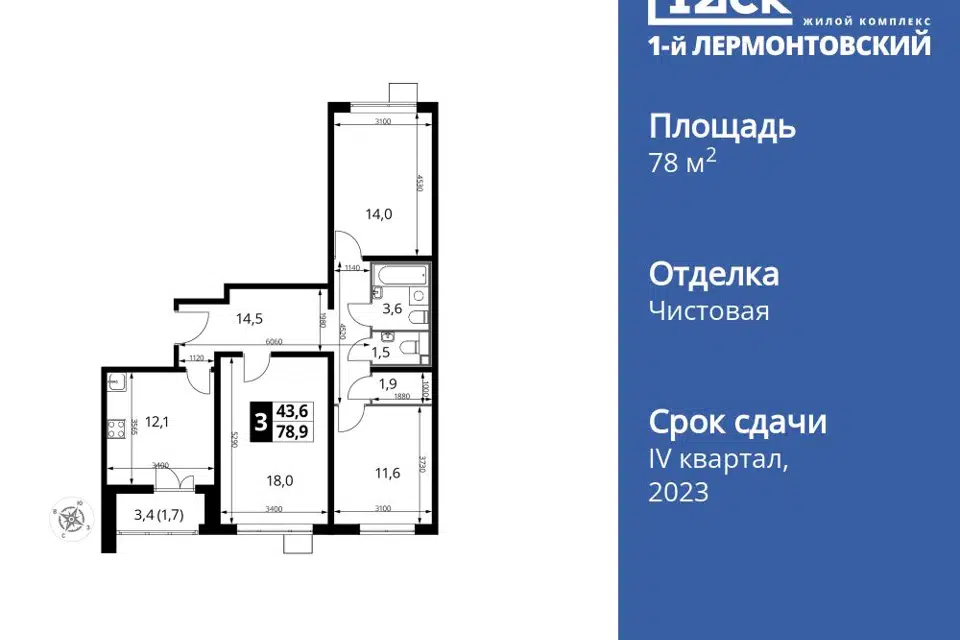 3-комн. кв., 78 м², 3/14 этаж