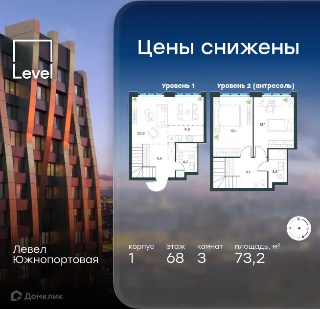 3-комн. кв., 73.2 м², 68/69 этаж