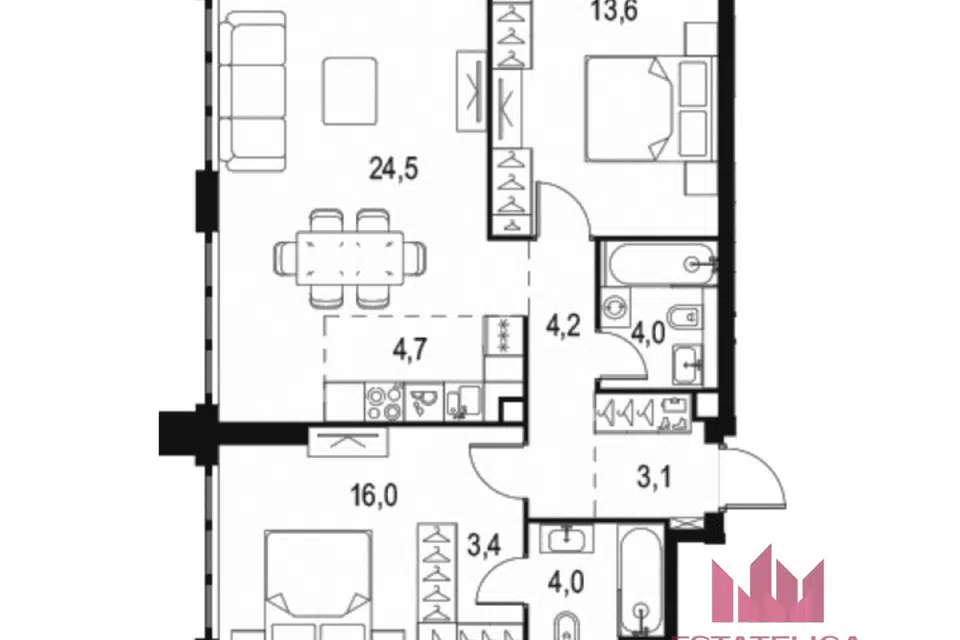 3-комн. кв., 96.4 м², 2/19 этаж
